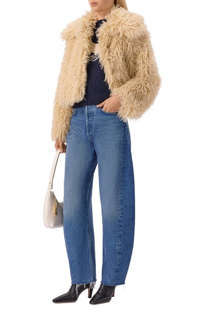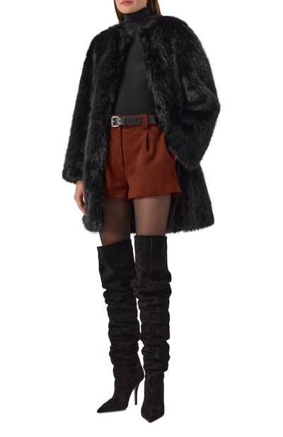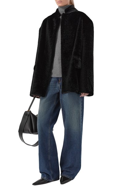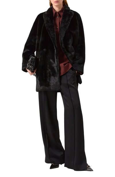 Шубу со смесовой подкладкой на основе вискозы выполнили из экомеха. Модель с боковыми карманами застегивается роговыми пуговицами.