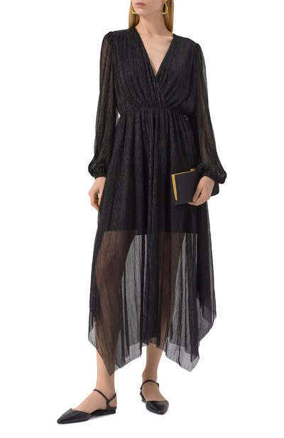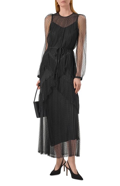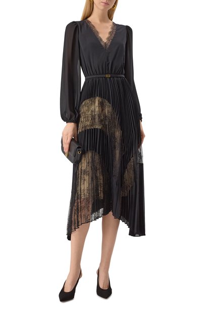 Мини-платье с подкладкой выполнили из полиэстерового кружева с цветочным мотивом. Модель с глубоким вырезом и расклешенными манжетами застегивается потайной молнией сбоку.