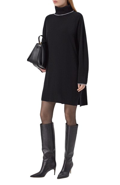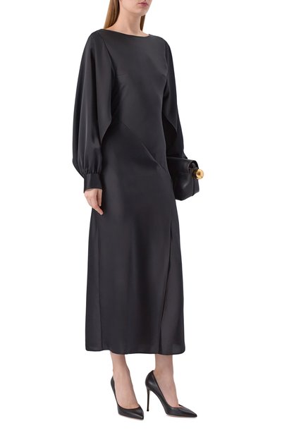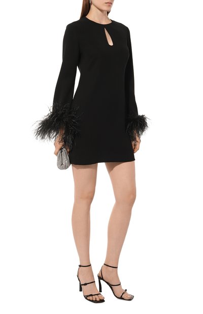 Короткое платье из полиэстера застегивается потайной молнией сзади. Завышенную линию талии, воротник-стойку и широкие манжеты драпированных рукавов подчеркнули кристальными цепочками.