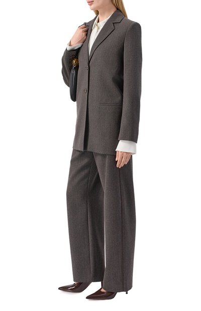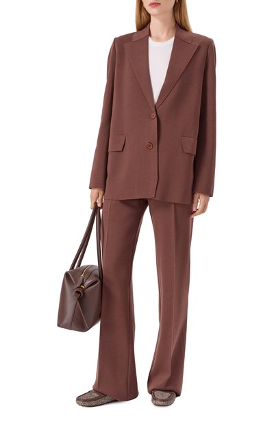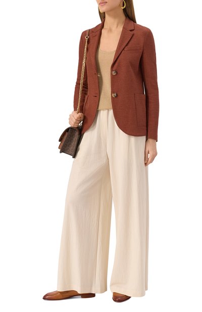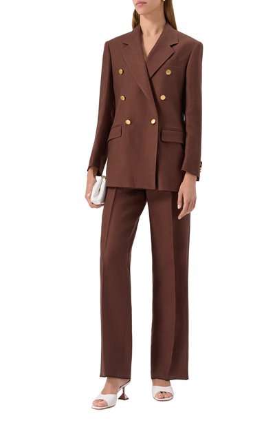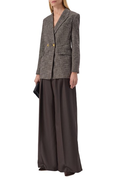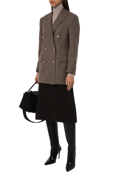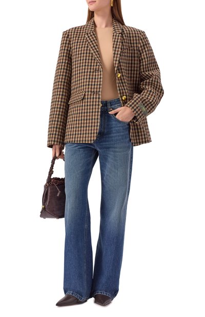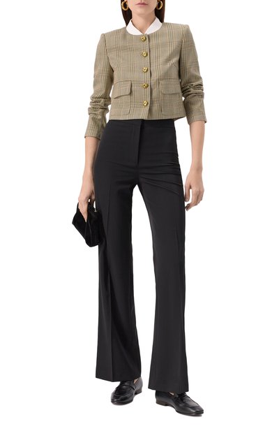 Однобортный клетчатый жакет прямого кроя выполнили из ткани на основе шерсти и полиамида. Модель на золотистых пуговицах с геральдическим мотивом дополнили шлицей, нагрудным карманом и боковыми с клапанами.