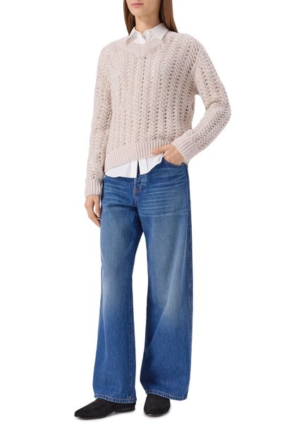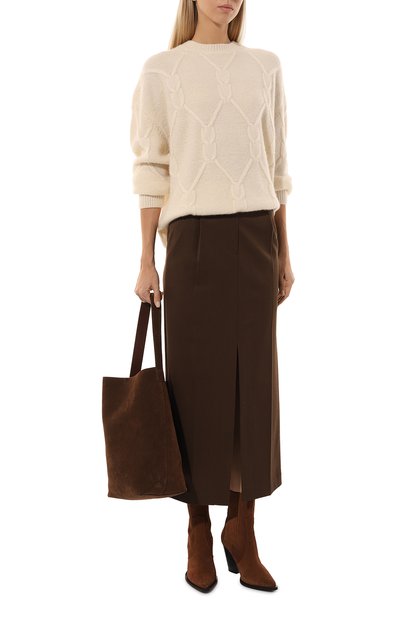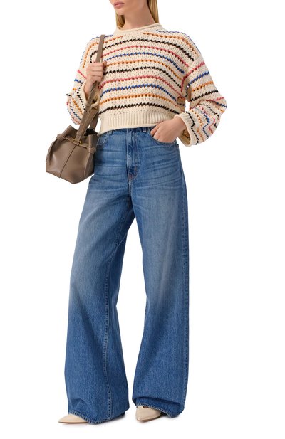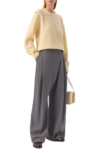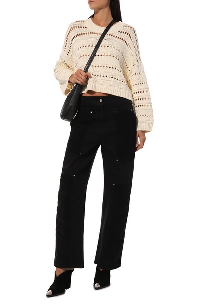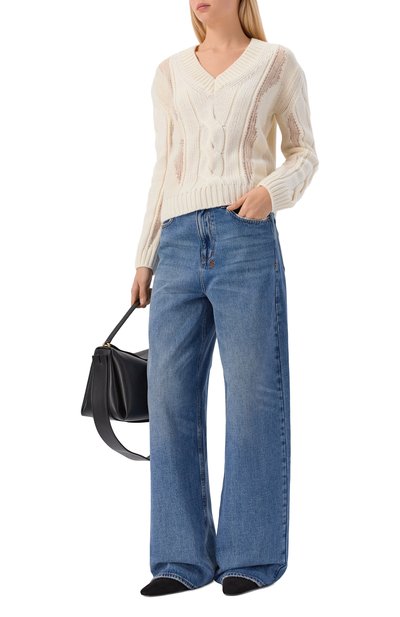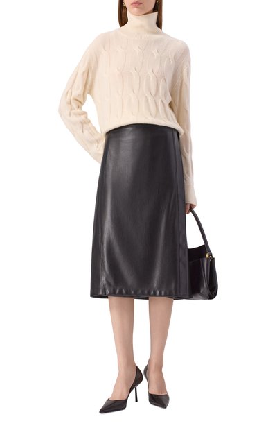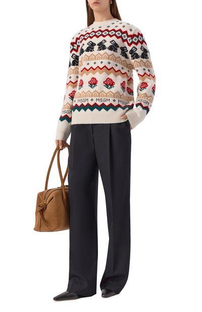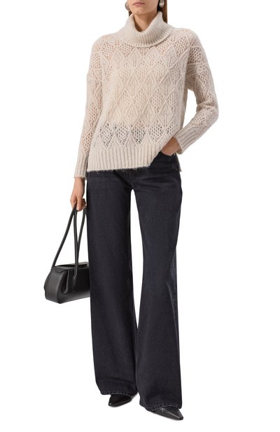 Свитер с рукавами реглан дополнили подворачивающимся высоким воротником и манжетами в рубчик. Модель с контрастным узором, подчеркнутым заклепками, связали из микса шерсти и полиамида.