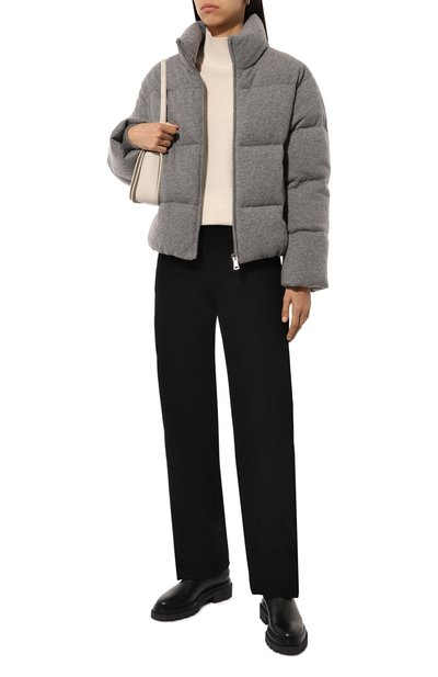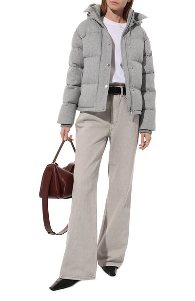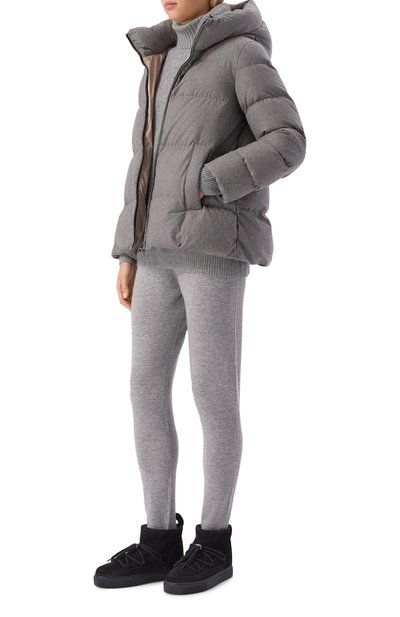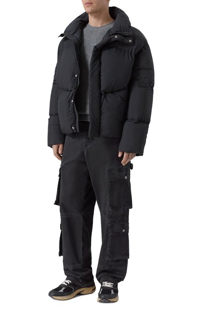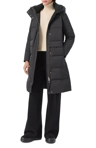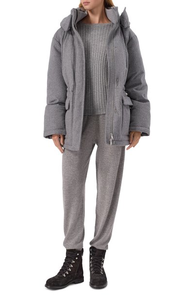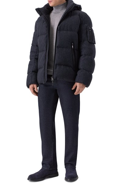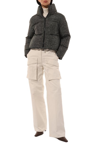 Утепленную синтепоном короткую куртку с двумя карманами по бокам выполнили из микса шерсти и нейлона с шевронным узором. На модели снизу, как и на капюшоне, предусмотрели кулиски. Пуховик застегивается молнией, скрытой под планкой на кнопках.