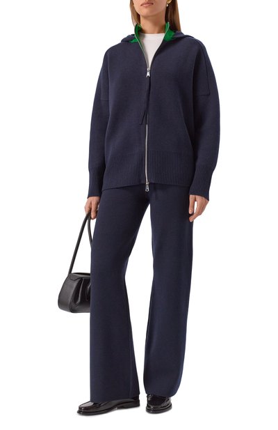 Брюки с лампасами-шнурком выполнили из костюмной шерсти с шевронным узором. У модели со средней посадкой предусмотрели два врезных кармана по бокам и пару карманов с листочкой сзади.