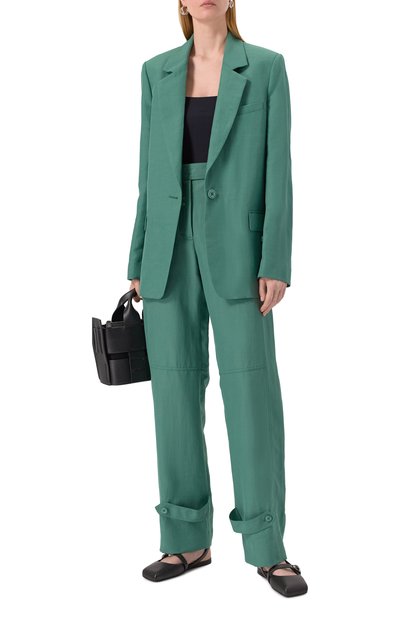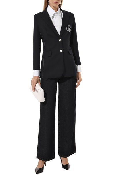 Жакет на подкладе выполнили из хлопкового бархата, продублировав остроконечные лацканы атласом. Таким же материалом обтянули пуговицы. Модель дополнили нагрудной листочкой и двумя боковыми карманами с клапанами.