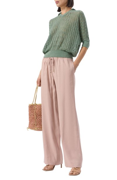 Свободные брюки связали из микса шерсти, вискозы и кашемира, сформировав по бокам рельефный узор. Модель с эластичным поясом-кулиской и двумя карманами составит гармоничный дуэт с парным кардиганом.