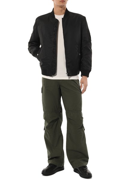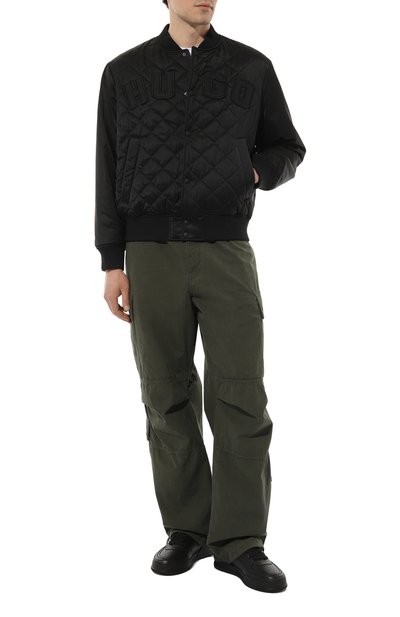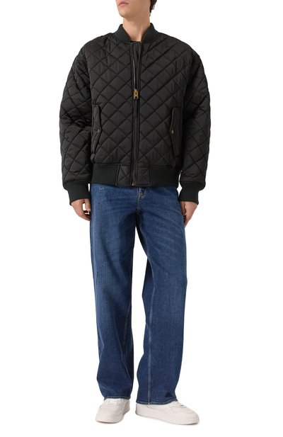 Бомбер с полосатыми манжетами и поясом из трикотажа в рубчик, застегивающийся кнопками, выполнили из плотной ворсистой ткани. Модель с боковыми карманами на молниях и отложным воротником декорировали аппликациями в виде костей на рукавах и вышитыми брендированными надписями спереди и на спинке.