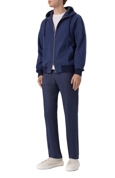 Для пошива толстовки с двумя врезными карманами использовали хлопковый вельвет с добавлением кашемира. Модель с воротником-стойкой, манжетами и поясом из трикотажа застегивается встречной молнией.
