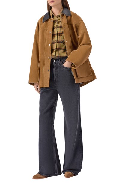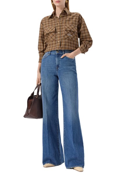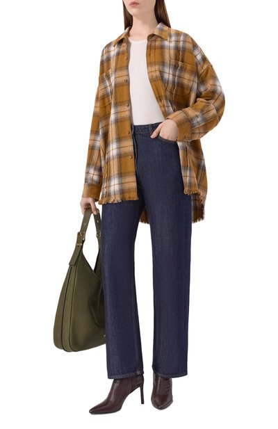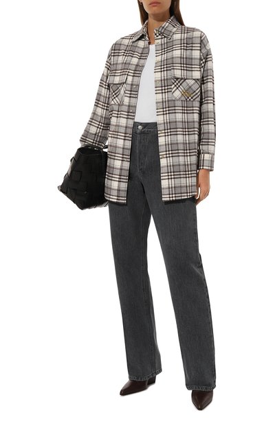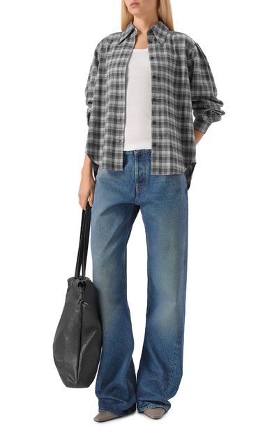 Клетчатую рубашку с обтяжными пуговицами выполнили из хлопка. Модель с закругленным низом дополнили нагрудным накладным карманом.