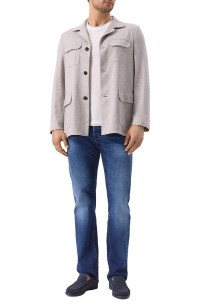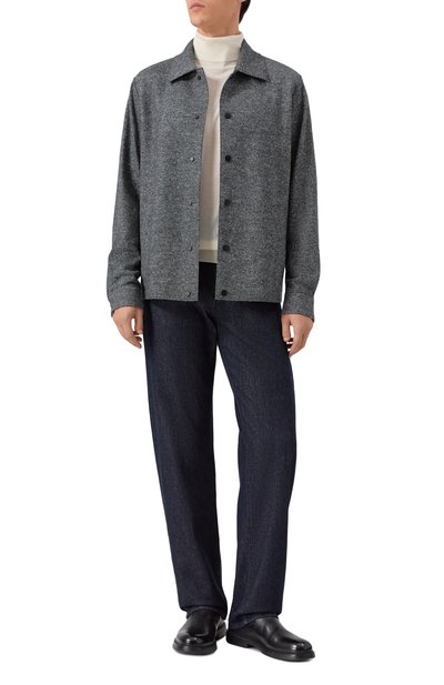 Для пошива рубашки с отложным воротником использовали мелкофактурный материал на основе шерсти и кашемира. Модель с большими нагрудными карманами с клапанами застегивается роговыми пуговицами.