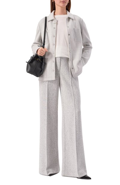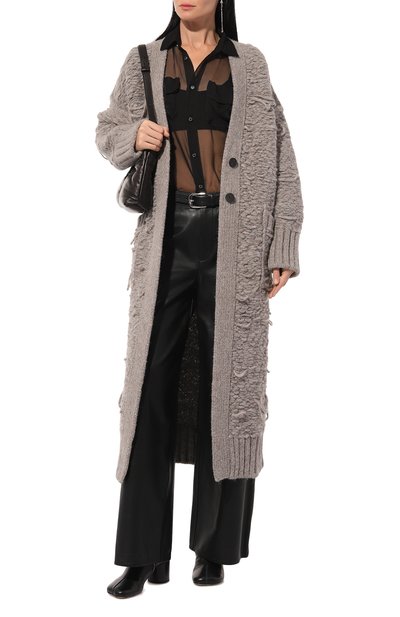 Длинный кардиган с V-образным вырезом и спущенной линией плеч связали из шерсти первого пострига, укрепленной полиамидом. Эластичную модель свободного кроя дополнили тремя карманами с отделкой в рубчик.