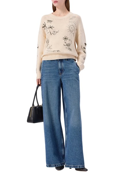 Укороченный свитер с арановым узором выполнили из пряжи на основе мериносовой шерсти, акрила и мохера, вывязав часть деталей тонкой нитью, чтобы создать иллюзию потертостей. Модель с V-образным вырезом декорировали вышитым логотипом на спинке.