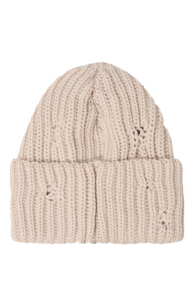 Шапку бини связали эластичным узором из хлопковой пряжи. Аксессуар дополнили широким отворотом, декорированным логотипом, словно нарисованным от руки краской.