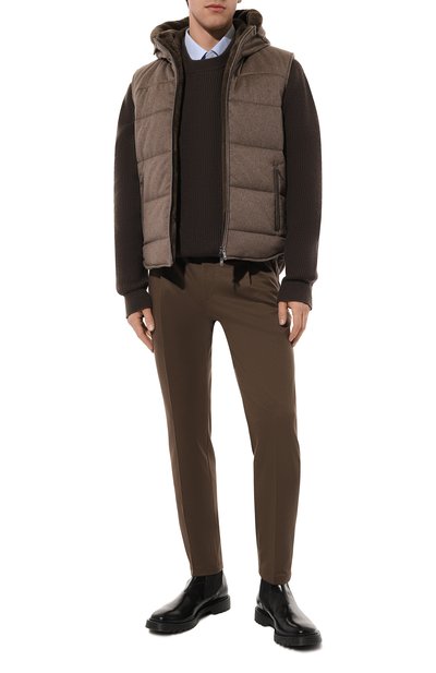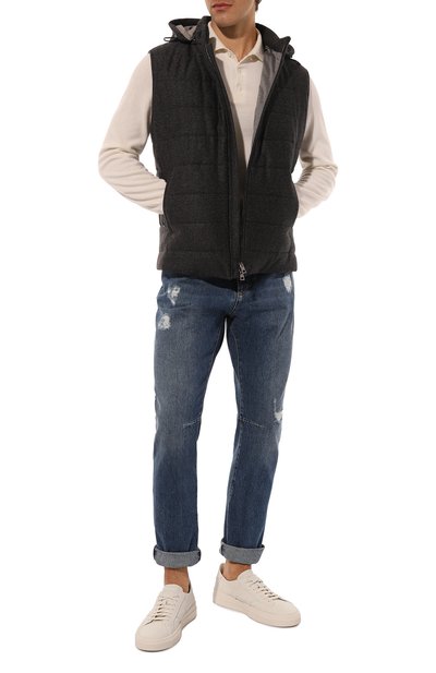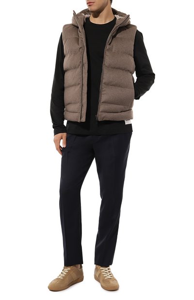 Стеганый жилет с трикотажной отделкой на воротнике-стойке сшили из кашемира с небольшим добавлением нейлона и эластана. Модель на встречной молнии дополнена двумя врезными карманами и шелковым подкладом.