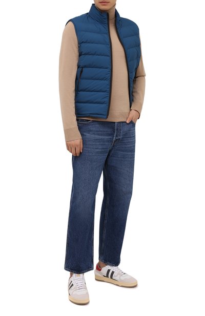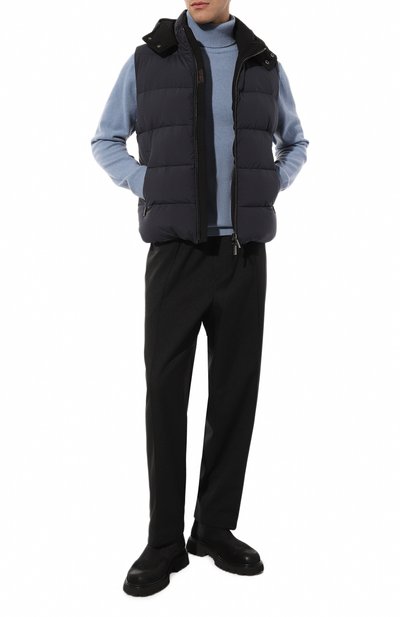 Утепленный жилет с боковыми карманами выполнили из полиэстера с добавлением полиуретана. Встречную молнию укрепили замшевым кантом, а внутреннюю сторону воротника отделали трикотажем.
