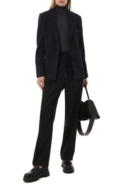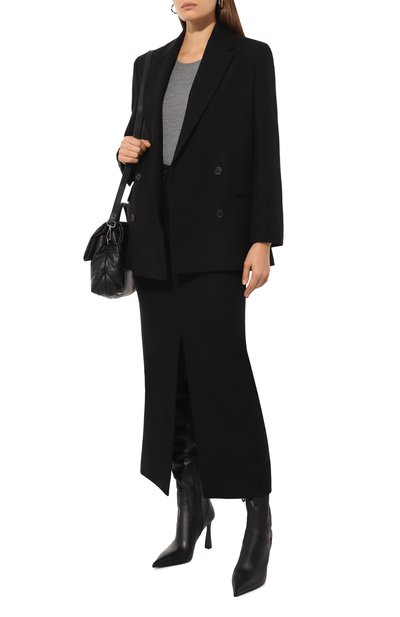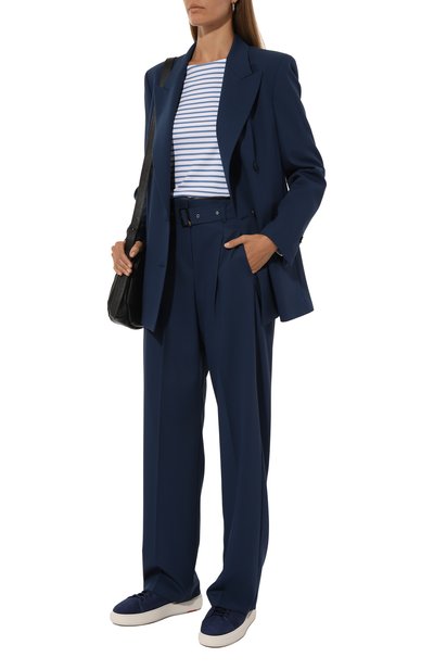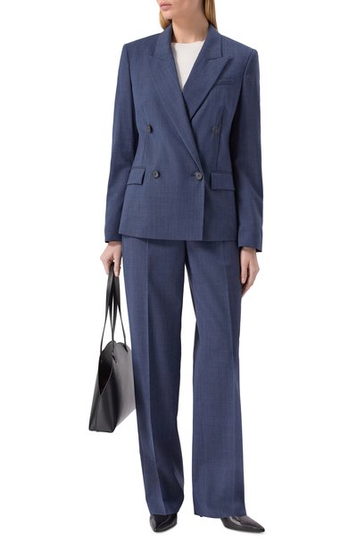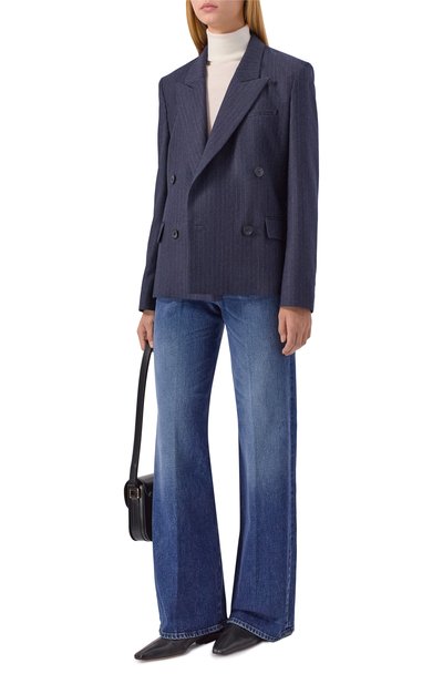 Двубортный жакет Pucci в узкую полоску выполнили из шерсти первого пострига. Слегка приталенная модель с двумя карманами и остроконечными лацканами застегивается роговыми пуговицами.