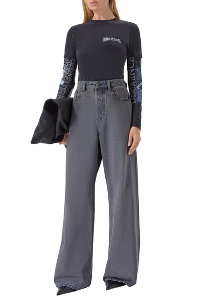 Приталенный лонгслив, напоминающий двухслойный комплект с футболкой, выполнили из хлопкового трикотажа. Спереди и на спинке немного выбеленную модель декорировали размытой эмблемой Political campaign.
