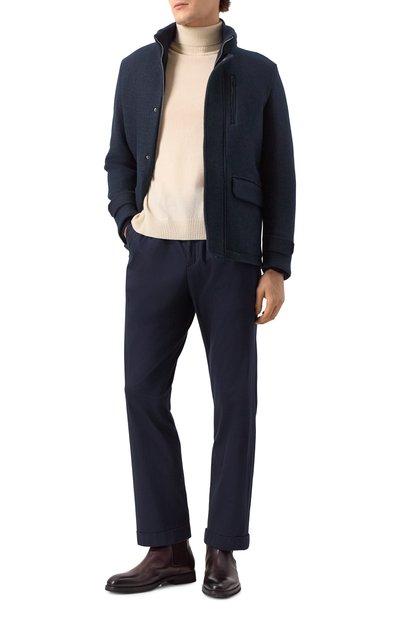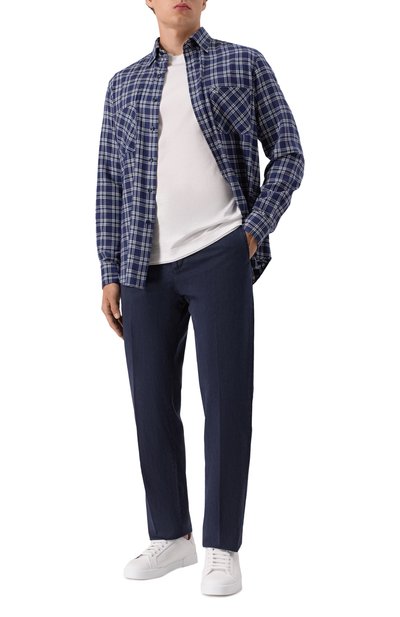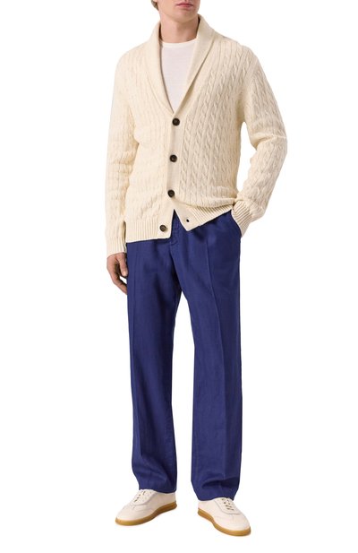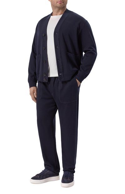 Брюки с тремя карманами выполнили из трикотажа на основе хлопка и шелка. Посадка модели регулируется шнурком с брендированными эглетами фирменного алого оттенка, продетым в рифленый пояс-кулиску.