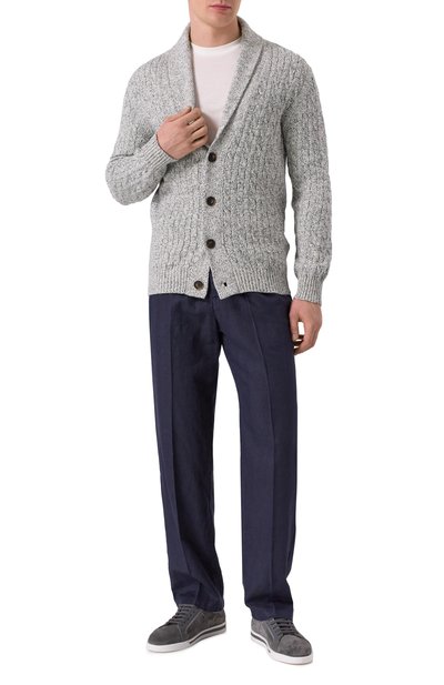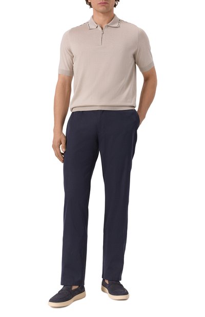 Брюки с тремя карманами выполнили из трикотажа на основе хлопка и шелка. Посадка м одели регулируется шнурком с брендированными эглетами фирменного алого оттенка, продетым в рифленый пояс-кулиску.