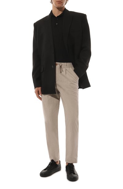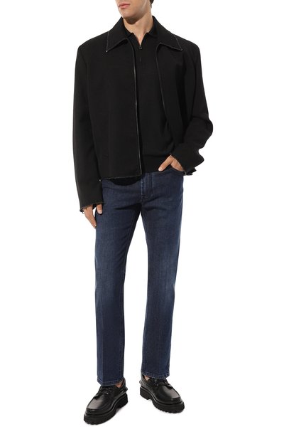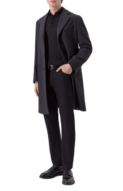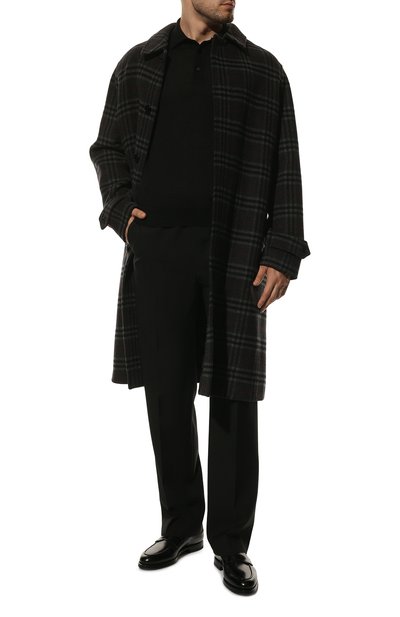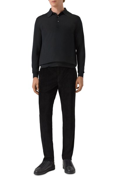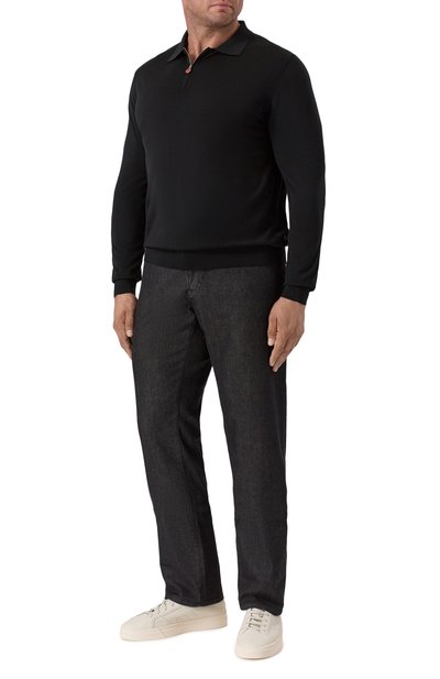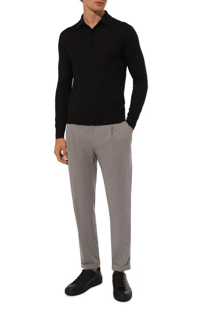 Однотонное поло с длинными рукавами органично впишется в базовый гардероб. Модель прямого кроя выполнили из тонкого шерстяного трикотажа с добавлением шелка.