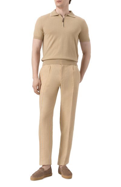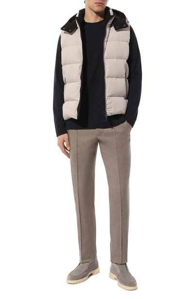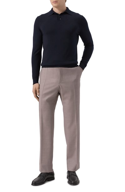 Брюки в клетку «принц Уэльский» выполнили из костюмной шерсти. Модель с защипами, стрелками и эластичной вставкой на поясе сзади дополнили двумя парами карманов.