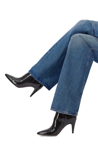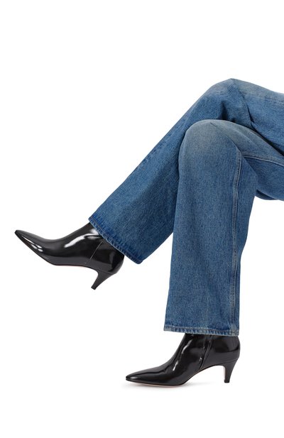 Ботильоны Jill из кожи ягненка застегиваются боковой молнией с брендированным пуллером. Конический каблук средней высоты украсили металлической монограммой Кассандра.