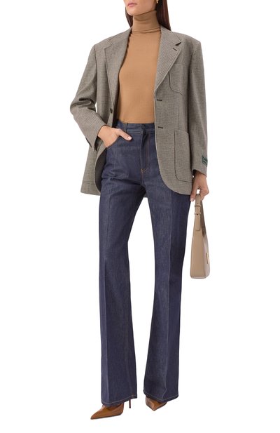 Свободную водолазку со спущенной линией плеч выполнили из трикотажа на основе шерсти, кашемира и шелка. Горловину с отворотом, манжеты и пояс модели связали в мелкий рубчик.