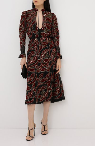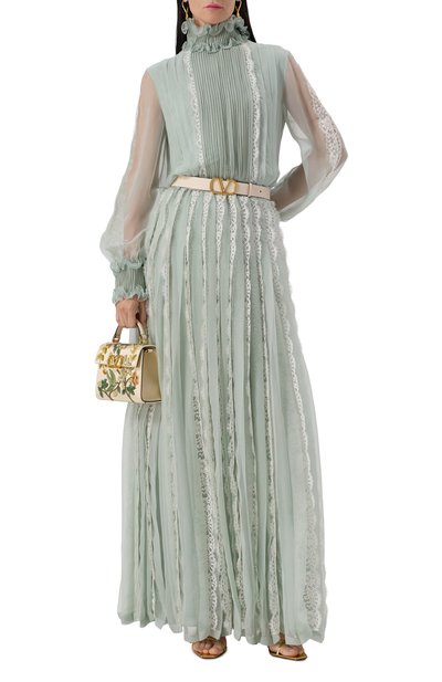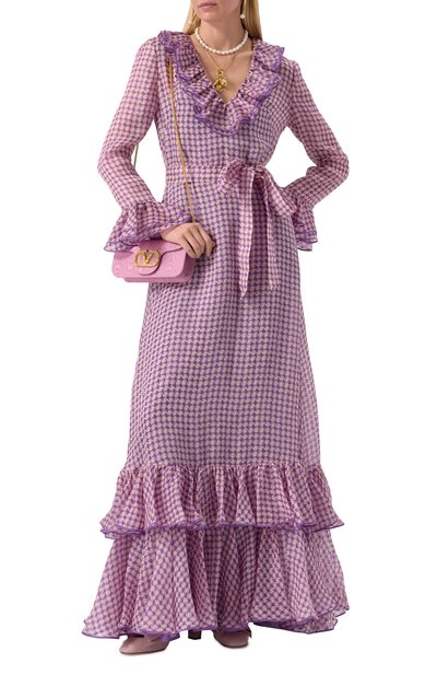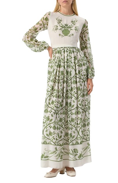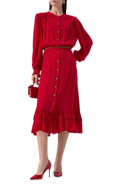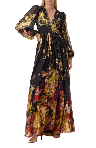 Для создания платья с супатной застежкой выбрали шелковый шифон с мотивом в виде маков. Роль акцента отдали воротнику аскот, а на талии предусмотрели кулиску. Модель с двухслойным струящимся подолом дополнили манжетами на пуговицах.