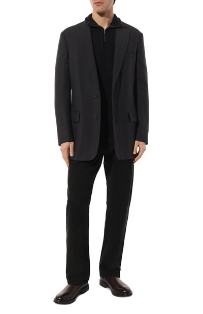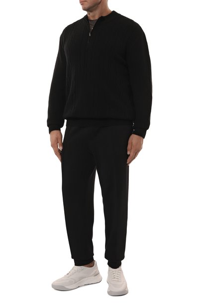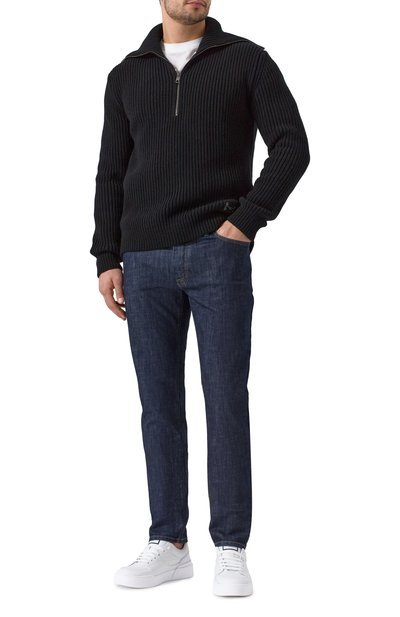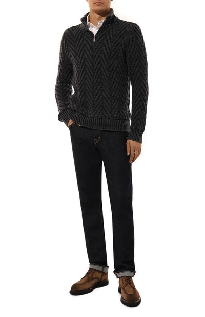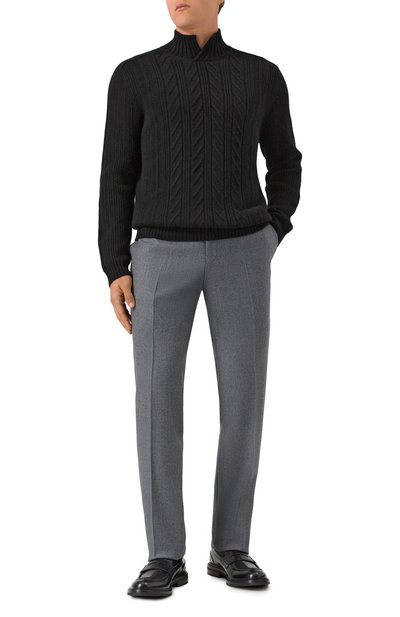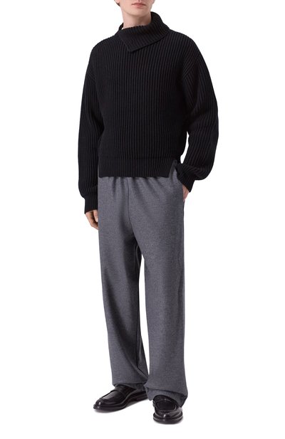 Свитер со слегка спущенной линией плеч связали рифленым узором из объемной кашемировой пряжи. Модель с высокой горловиной застегивается пуговицами.