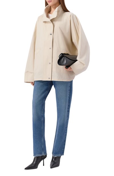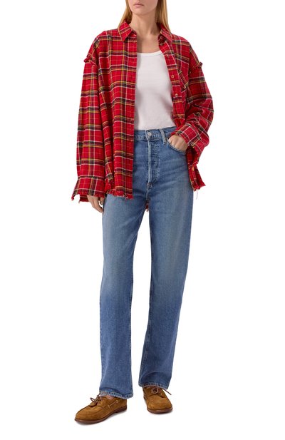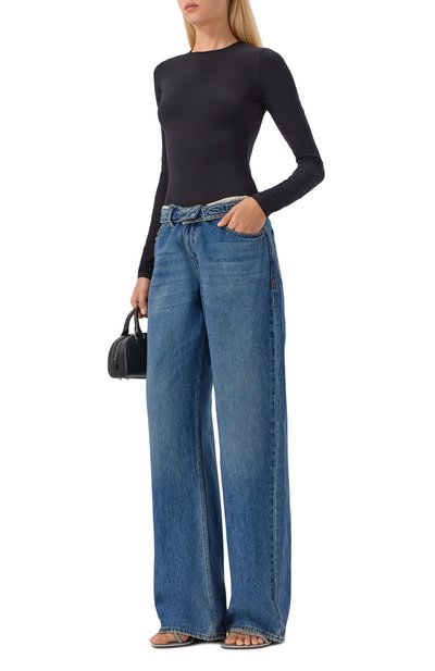 Выбеленные джинсы Playback с высокой посадкой, пятью карманами и боковыми разрезами изготовили из неэластичного денима. Модель декорировали серебристыми заклепками, вышивкой в виде фирменных крестов 3х4 и эмблемой T-box.