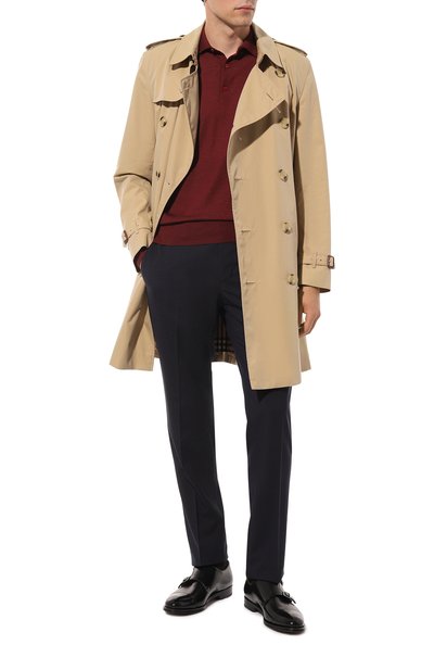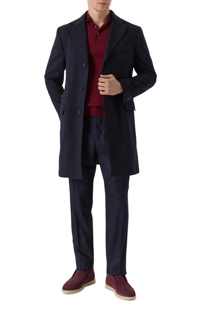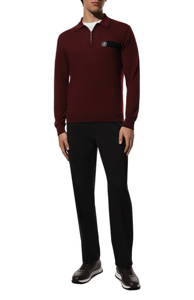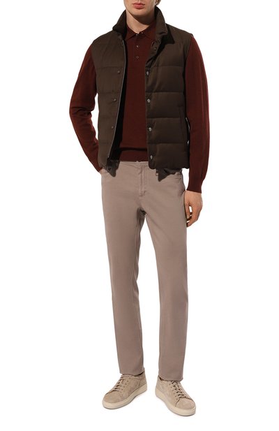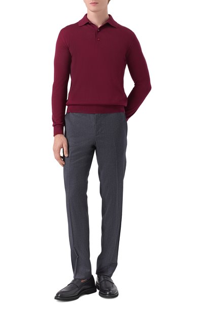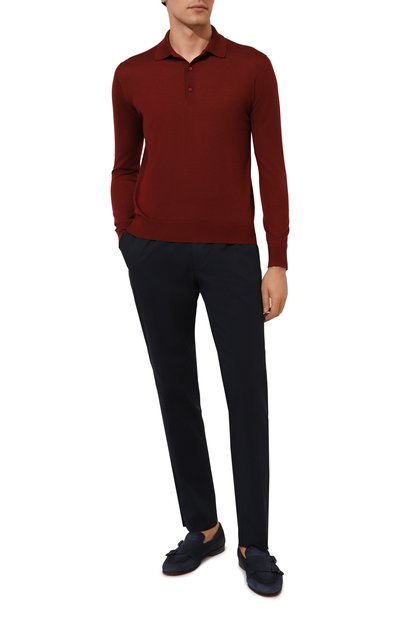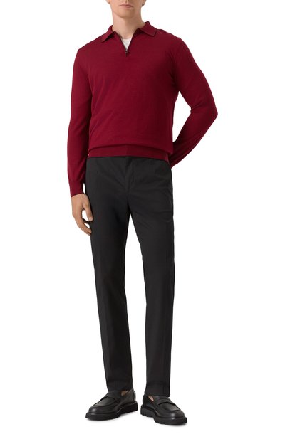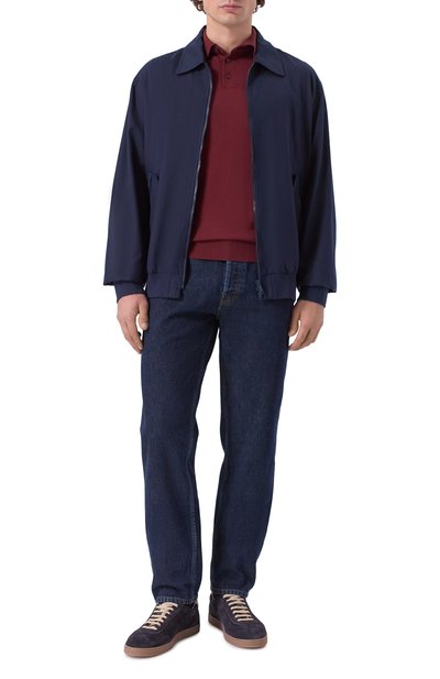 Поло выполнили из трикотажа на основе кашемира и шелка. Лаконичная модель с эластичными манжетами и поясом застегивается короткой пуговичной планкой.
