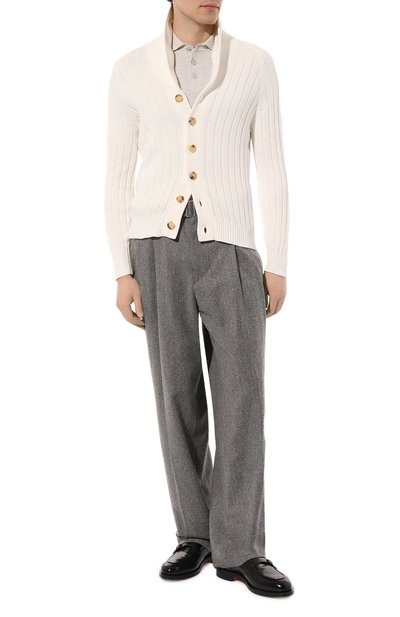 Кардиган с шалевыми лацканами выполнили ребристой вязкой из шерстяной пряжи с добавлением кашемира. Модель дополнили боковыми накладными карманами.