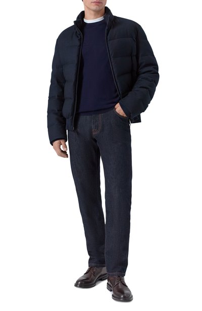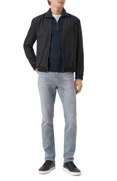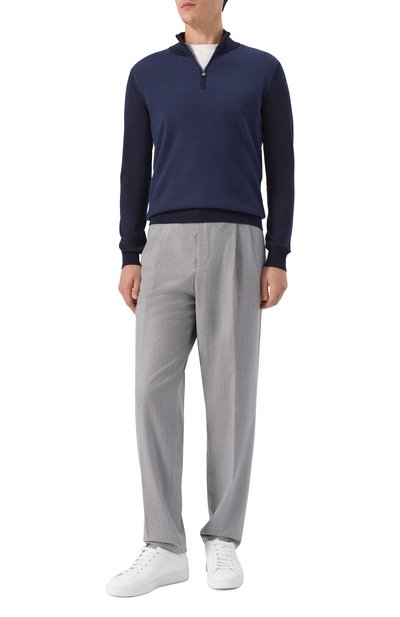 Джемпер с нагрудной молнией выполнили из шерсти, усиленной шелком. Модель со смещенными назад плечевыми швами дополнили поясом, манжетами и высоким воротником в рубчик.