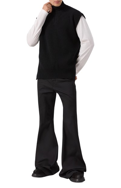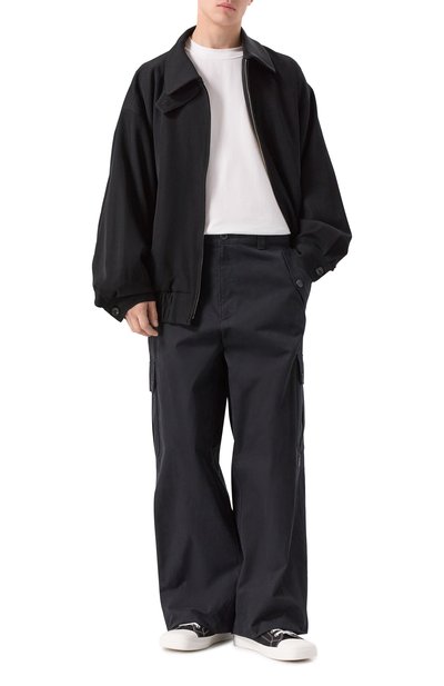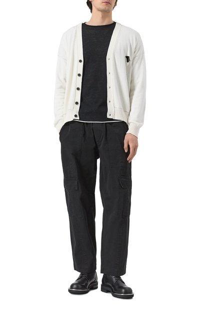 Широкие брюки из выбеленного хлопкового канваса дополнили кулисками по низу и защипами в области колен. Помимо врезных боковых карманов с клапанами предусмотрели накладные задние и карго.
