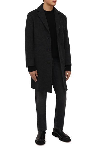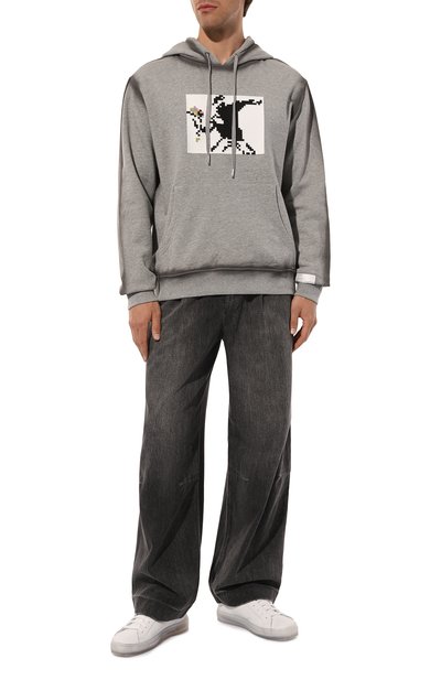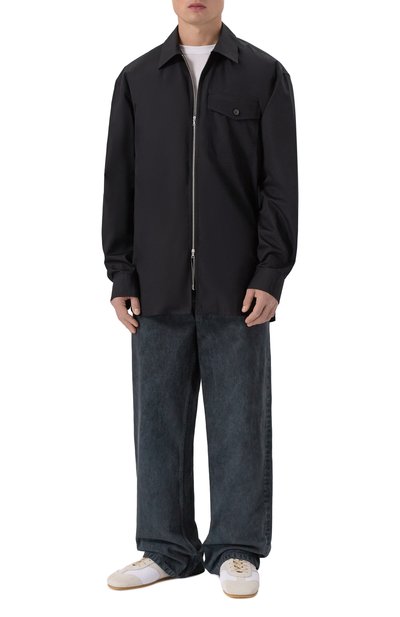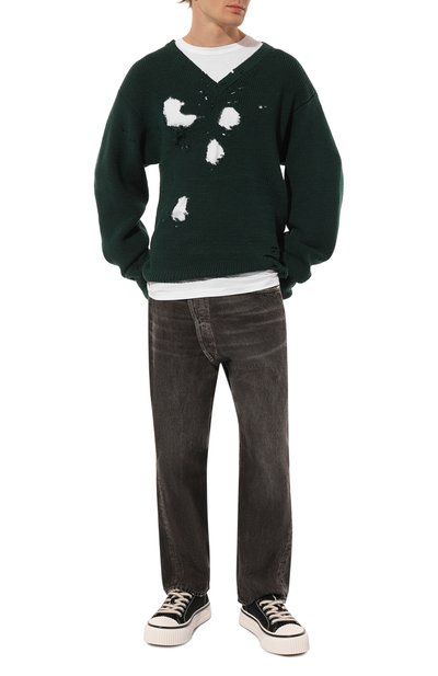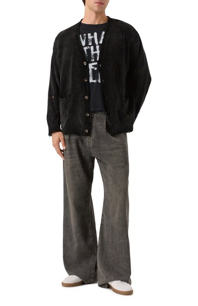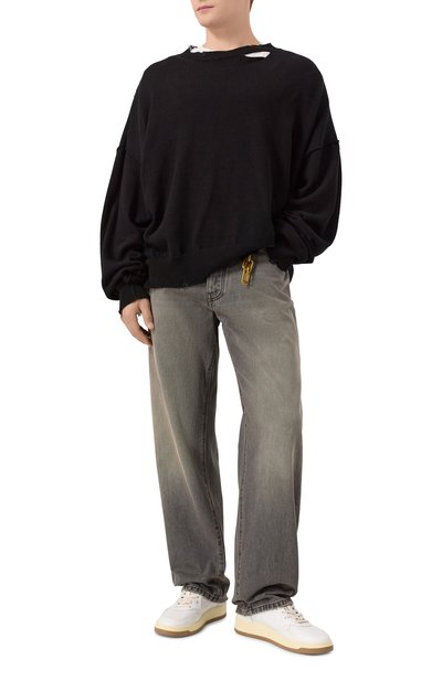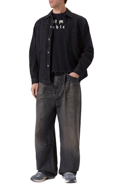 Широкие джинсы с пятью карманами выполнили из хлопкового денима с декоративными заломами. Пояс сзади дополнили фигурным брендированным патчем, форму которого повторяет подвеска на шлевке спереди.