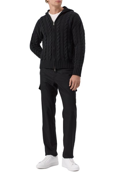 Кардиган с арановым узором выполнили из нежного baby-кашемира, вычесанного вручную у козлят породы Hirens Bottus Lansger. По бокам предусмотрели врезные карманы с листочками. Модель с высокой горловиной застегивается встречной молнией.