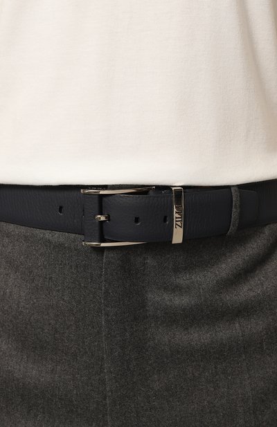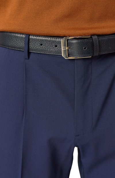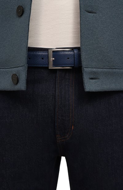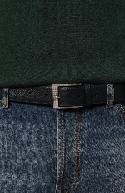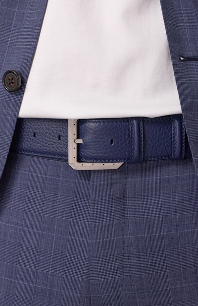 Ремень, представленный эксклюзивно в ЦУМе, изготовили из гладкой кожи, вручную окрашенной в фирменной технике velatura. Аксессуар дополнен прямоугольной металлической пряжкой и неподвижной шлевкой с фактурным плетением.