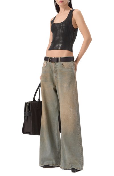 Топ с широкими бретелями связали из шерсти первого пострига с добавлением кашемира. Зигзагообразный мотив подчеркнули круглыми заклепками.