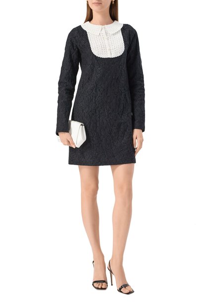 Свободное платье с воротником «поло» на рифленой V-образной горловине украсили контрастным вышитым логотипом спереди. Для изготовления модели с необработанным низом, закручивающимся в ролик, использовали хлопковый трикотаж.