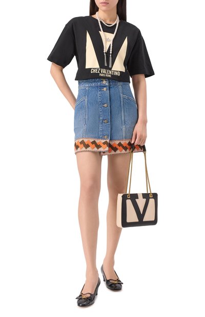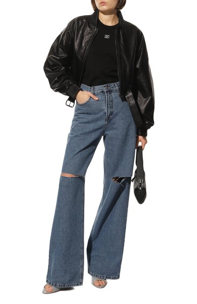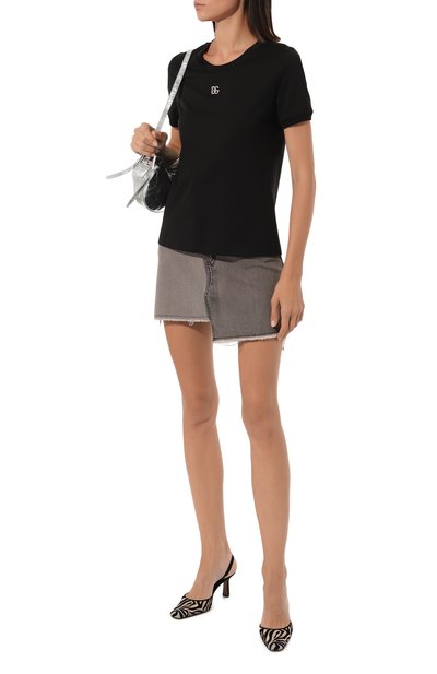 Укороченную футболку с круглой горловиной в рубчик выполнили из хлопкового джерси. Спереди приталенную модель украсили логотипом, выложенным стразами.