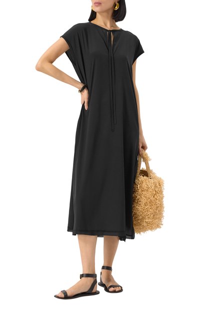 Платье-поло с короткой пуговичной планкой и врезными боковыми карманами сшили из японского хлопкового трикотажа. Отложной воротник украсили контрастной каймой с логотипом марки.