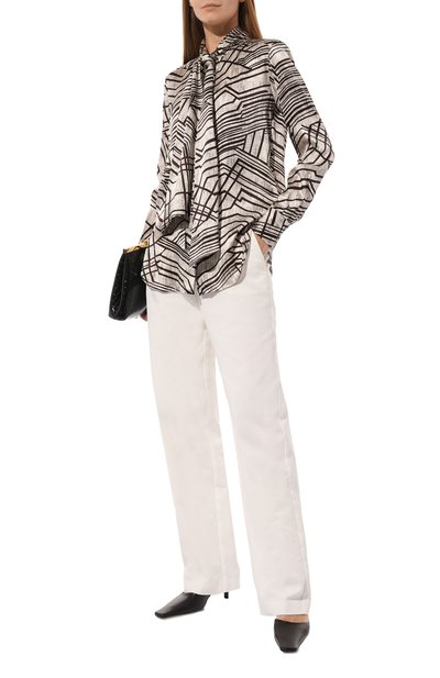 Блузу свободного кроя выполнили из тонкой ткани на основе лиоцелла с добавлением полиэстера и льна. Модель с разрезами на широких манжетах декорировали объемной драпировкой спереди.