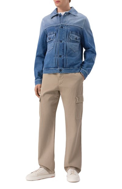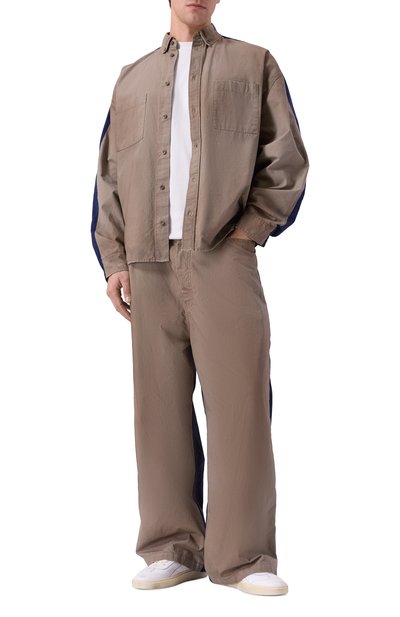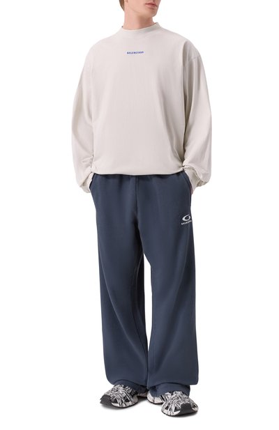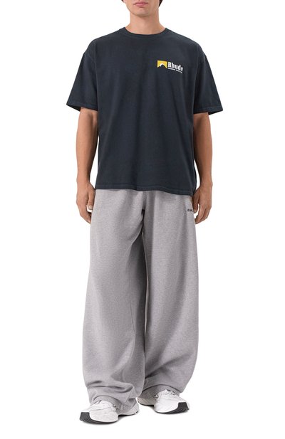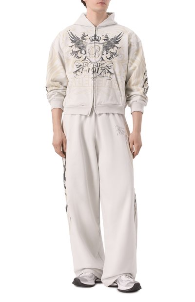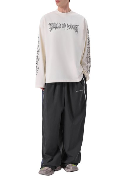 Широкие брюки с эластичным поясом и потертостями по краям выполнили из плотного хлопкового трикотажа. Модель с врезными боковыми карманами украсили надписями и брендированным патчем.