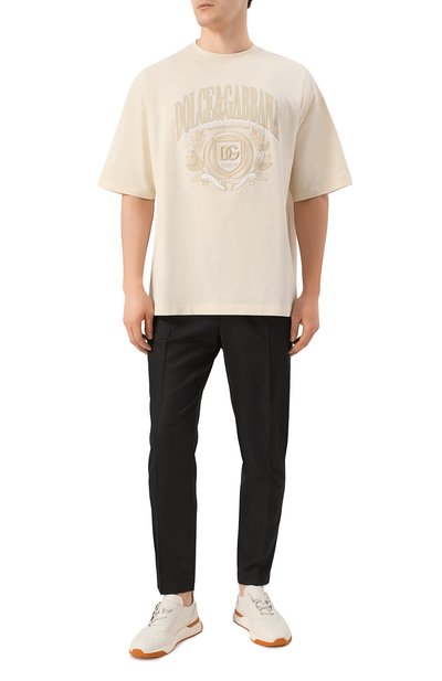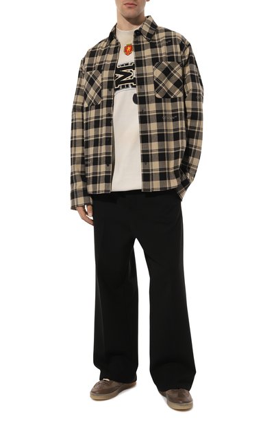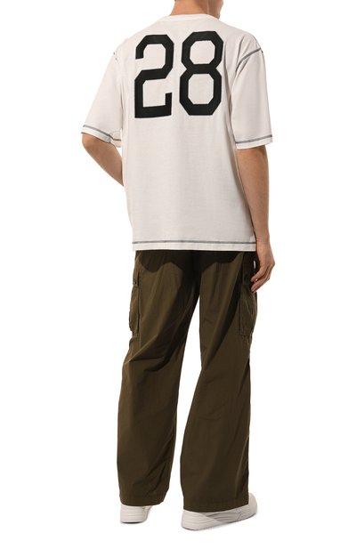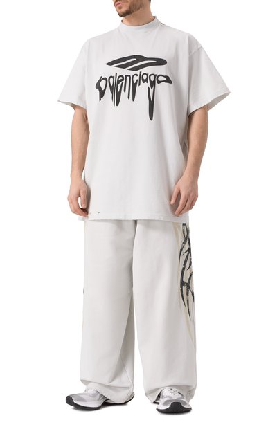 Футболку силуэта oversize выполнили из хлопкового джерси. Спереди и на спинке модель декорировали логотипами, словно сложенными из отрезков клейкой ленты.