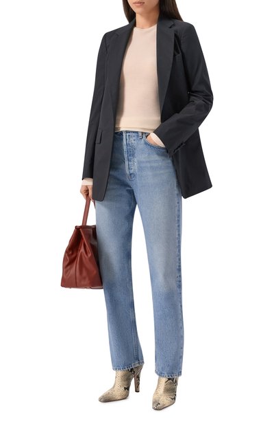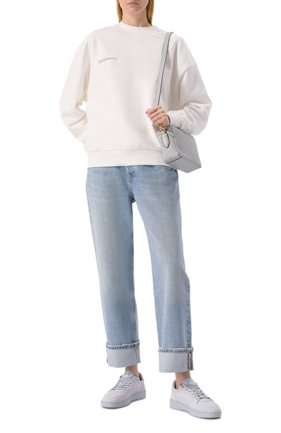 Джинсы 90’s с высокой посадкой сшили из регенерированного хлопкового денима с декоративными потертостями. Укороченную модель дополнили пятью карманами.