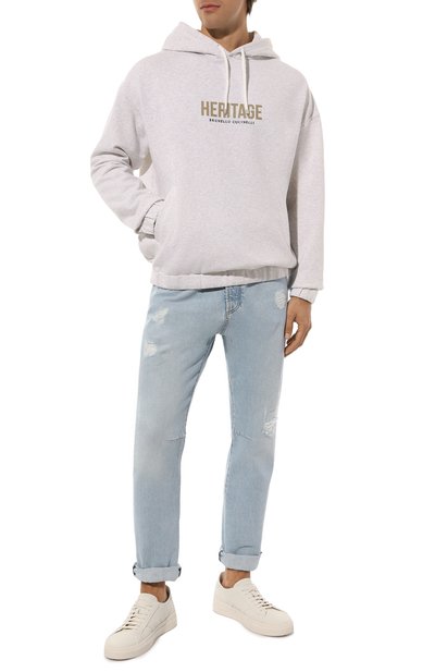 Свободное худи с декоративными пятнами краски украсили фирменной нашивкой на левом рукаве и логотипом GD English на груди и спинке. Модель с приспущенной л инией плеч и карманом «кенгуру» выполнили из хлопкового трикотажа.