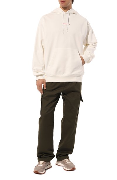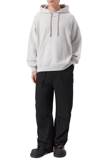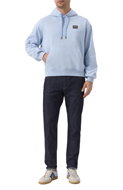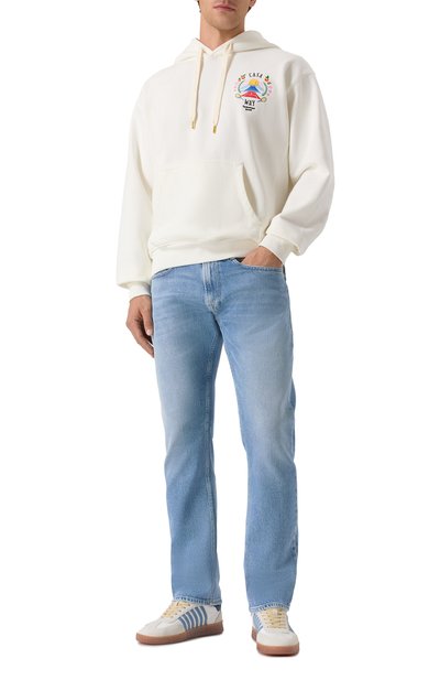 Свободное худи с декоративными пятнами краски украсили фирменной нашивкой на левом рукаве и логотипом GD English на груди и спинке. Модель с приспущенной линией плеч и карманом «кенгуру» выполнили из хлопкового трикотажа.