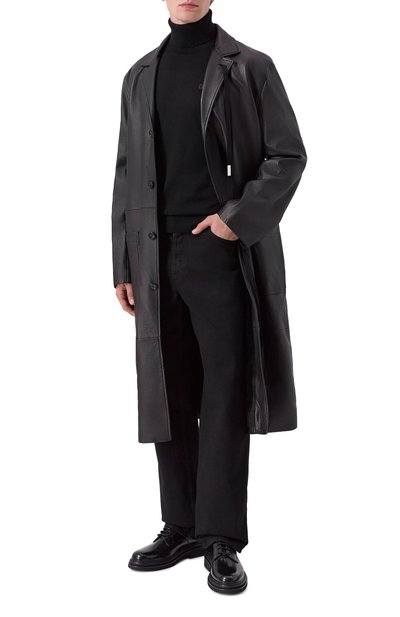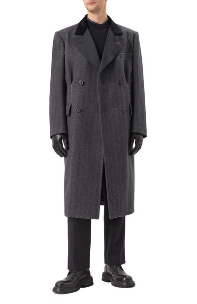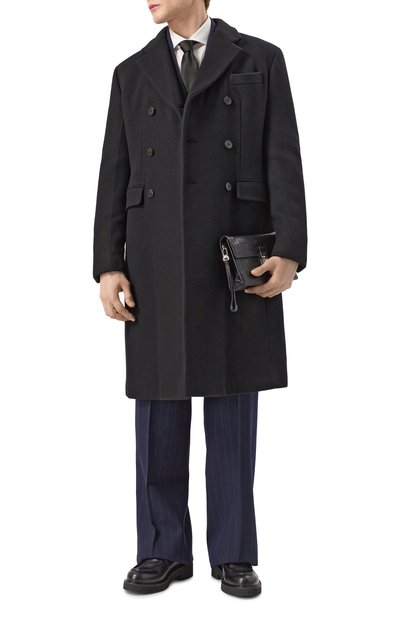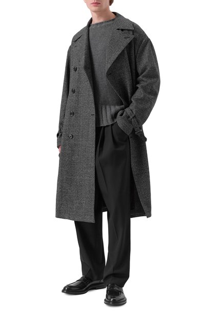Двубортное пальто с регулируемыми патами на манжетах, высокой шлицей сзади и отлетными кокетками дополнили боковыми карманами. Модель выполнили из двойного шерстяного габардина. В комплекте – пояс с D-образными кольцами.
