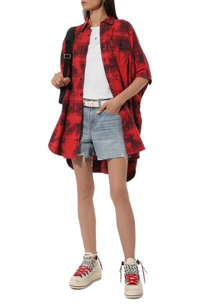 Высокие текстильные кеды Loved to Death состарили при помощи потертостей, искусственных разрывов, необработанных срезов и небрежных стежков. Верх установили на резиновую подошву с декоративной трещиной и сильно стершимся фирменным числовым кодом.