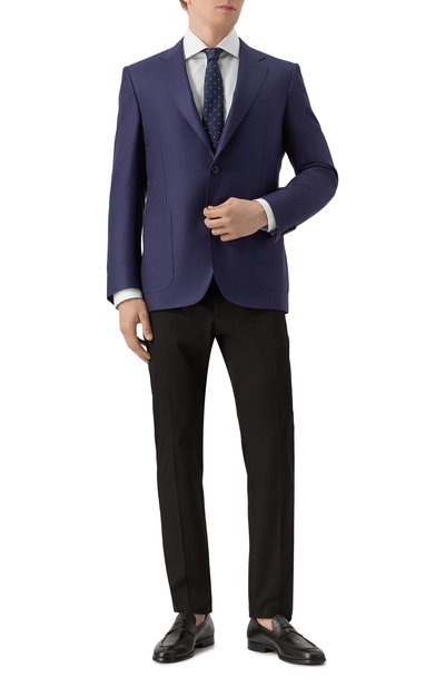 Полуприталенный однобортный пиджак с двумя шлицами выполнили из плотной шерстяной ткани, напоминающей деним. Немного выбеленные края модели с врезным нагрудным и накладными боковыми карманами подчеркнули декоративной строчкой пунто.