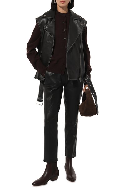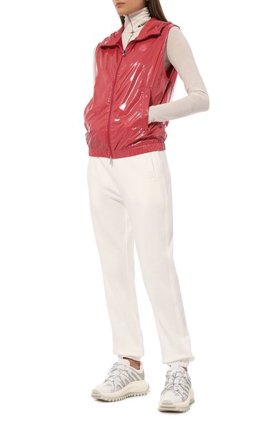 Жилет с эластичным поясом выполнили из экокожи. Модель с отделкой из искусственного меха украсили брендированной нашивкой сзади. Молнию скрыли под штормовой планкой на кнопках.